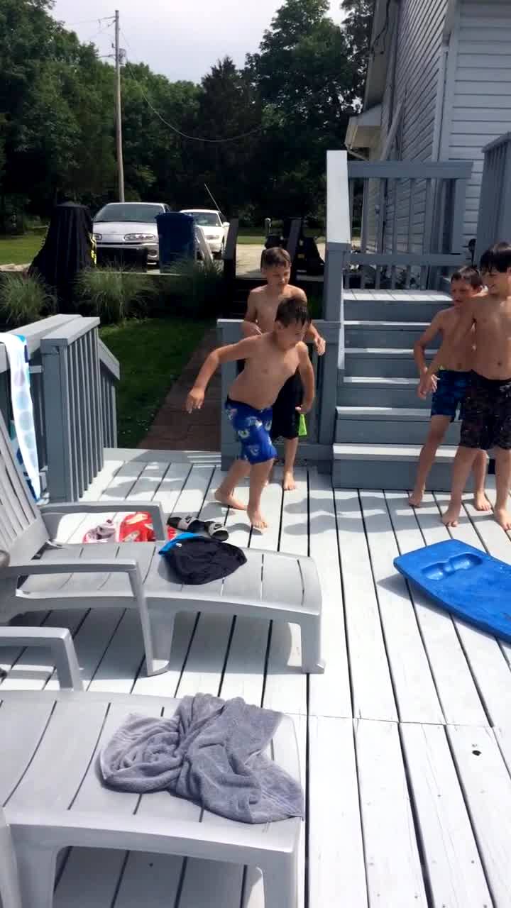 A baby falls backwards in a small swimming pool whenever a woman scares him outdoors.