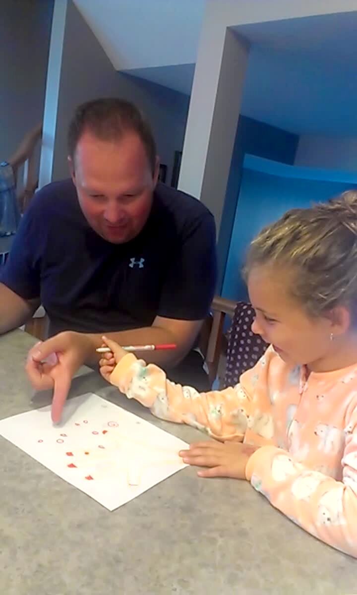 A man at a kitchen table says his young girl daughter can do a magic trick where he writes a number and she can circle the number with her eyes closed. She circles on a piece of paper and then he writes in the number afterwards and pretends she correctly circled the number. She doesn't know how she is doing it.