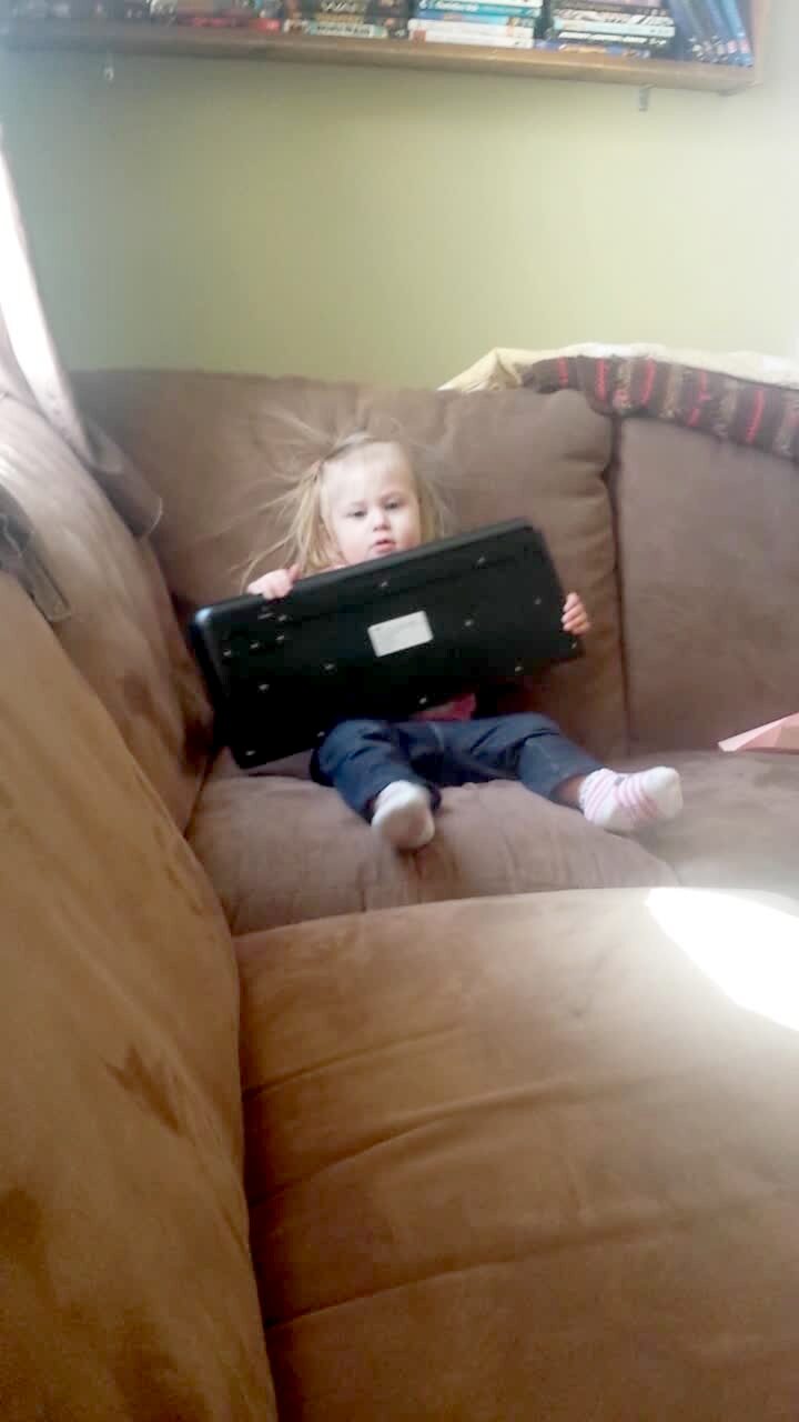 A young girl runs in the yard and trips and falls into a mud puddle. She gets up and tells her mom that she "got dirt." Then she runs to her dad to tell him what happened.