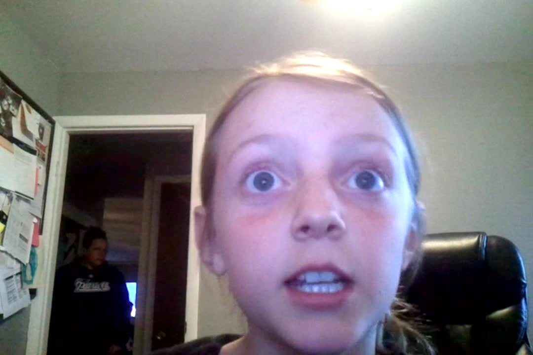 Young girl has a big bald spot because she got her long hair caught in the mixer while making brownies. Girl cries. Only shows the aftermath.