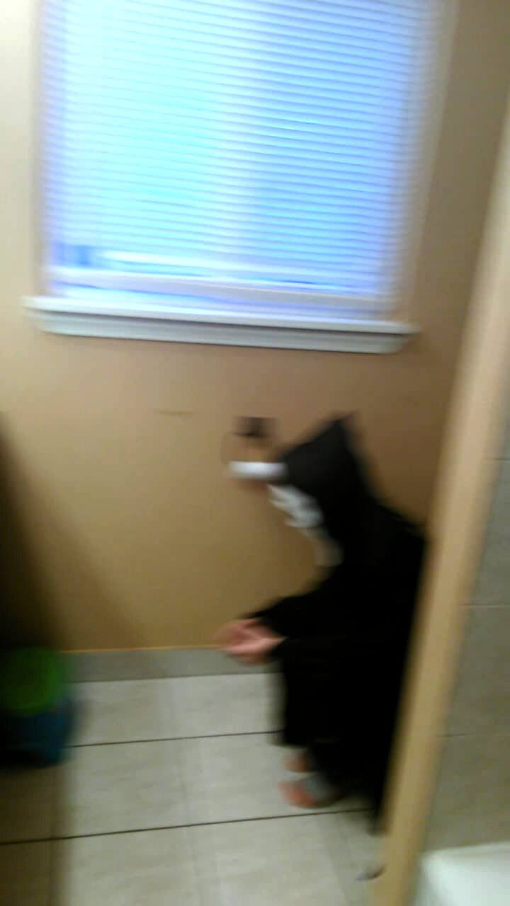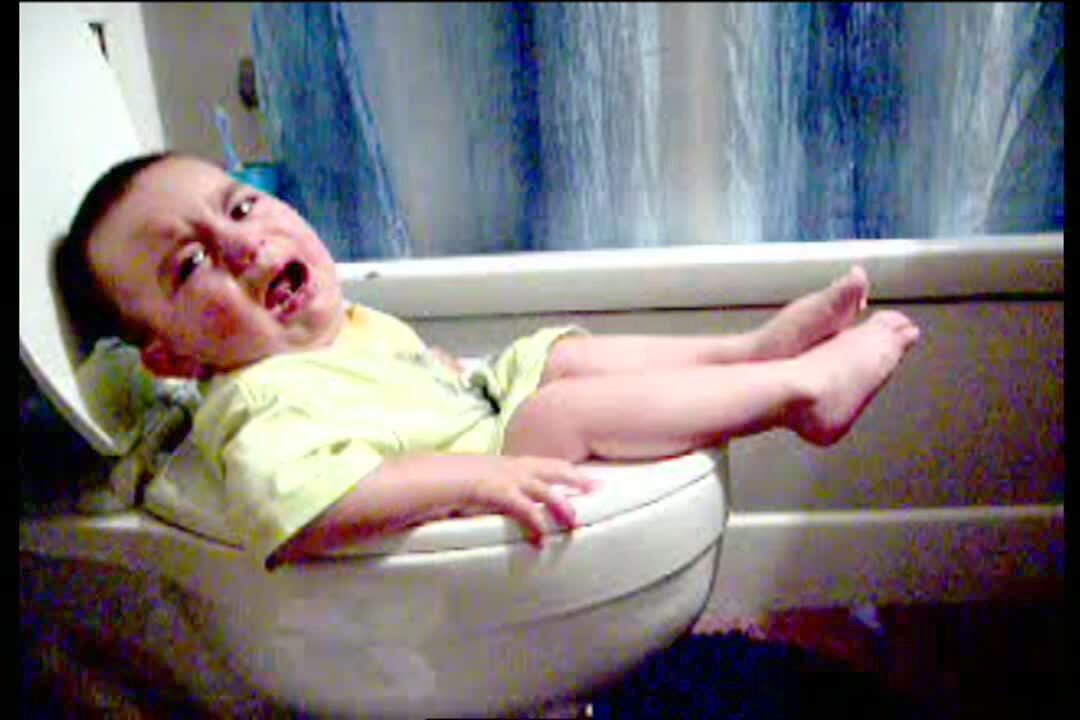 Tot boy is stuck inside a toilet bowl. He cries. Bathroom.