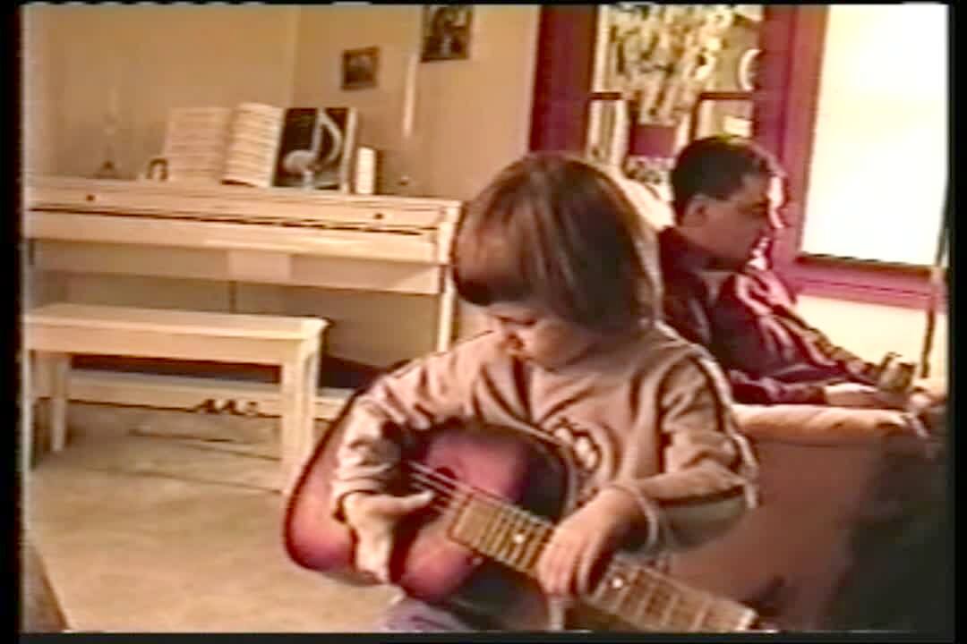 Tot girl holding a guitar accidentally hits woman behind the camera with the guitar.