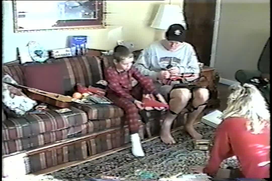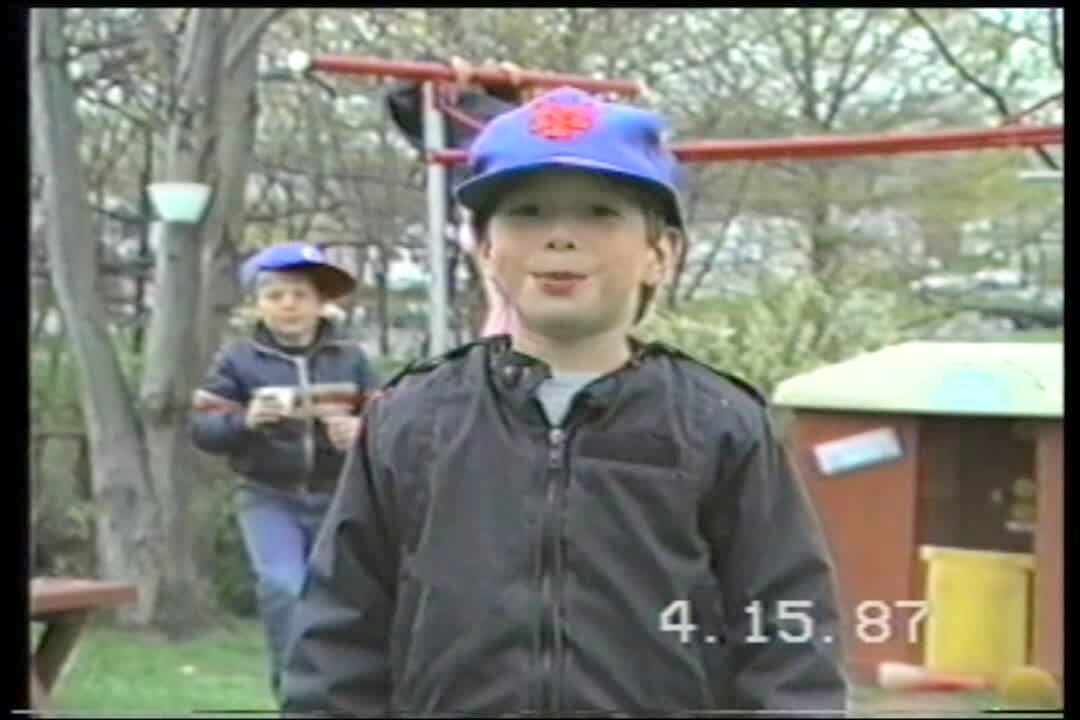 Young boy walks up to camera & says 'Hi, I'm Glenn Rush & I used to play for the NJ Devils." Older brother comes up behind boy & hits him across the face hard. With recovery. Sibling rivalry. Hockey.
