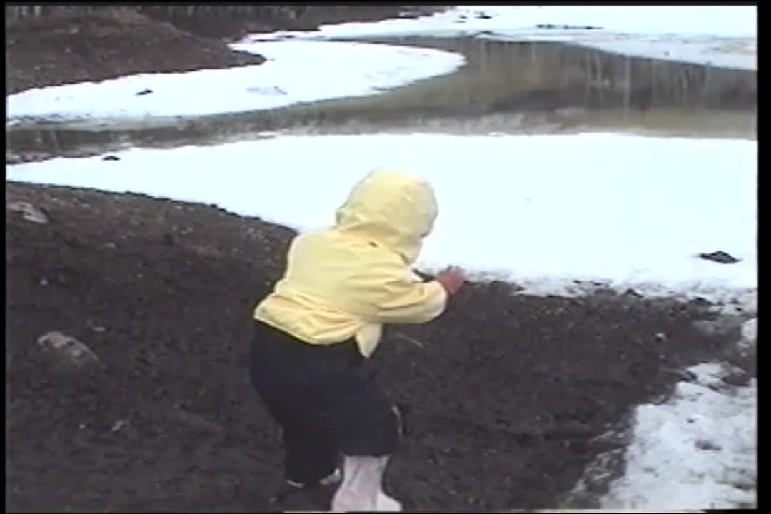 "Stroller Roller" Young girl pushes a stroller down the sidewalk with a baby doll in it. She lets stroller go wind carries it backwards. Carriage falls over in the grass.
