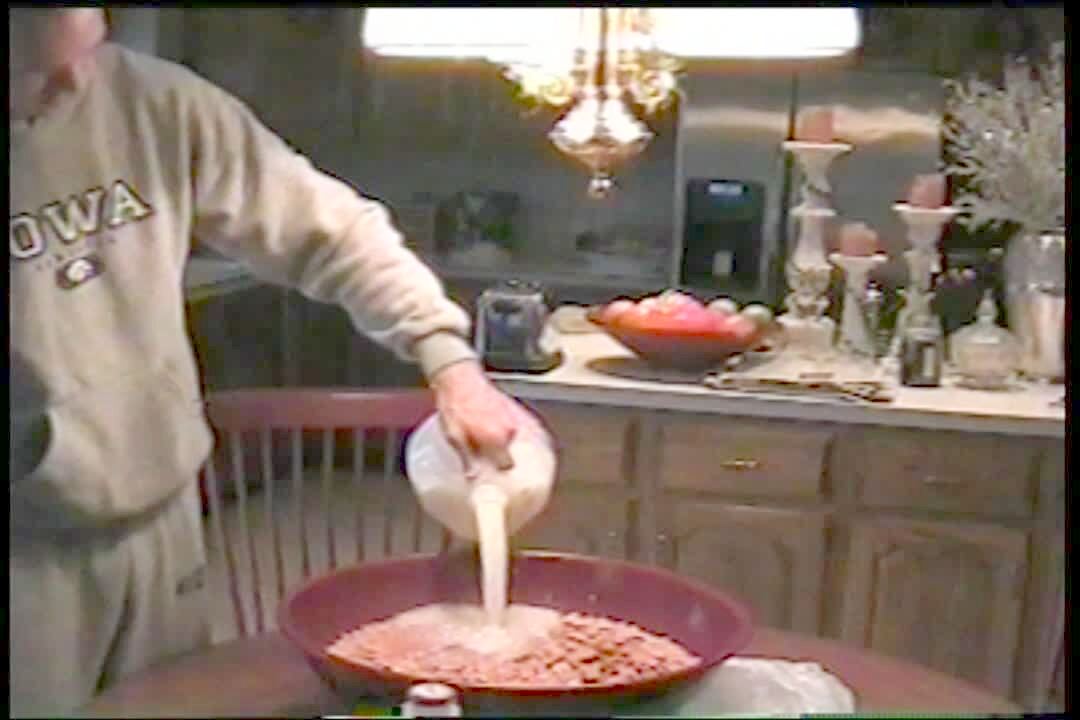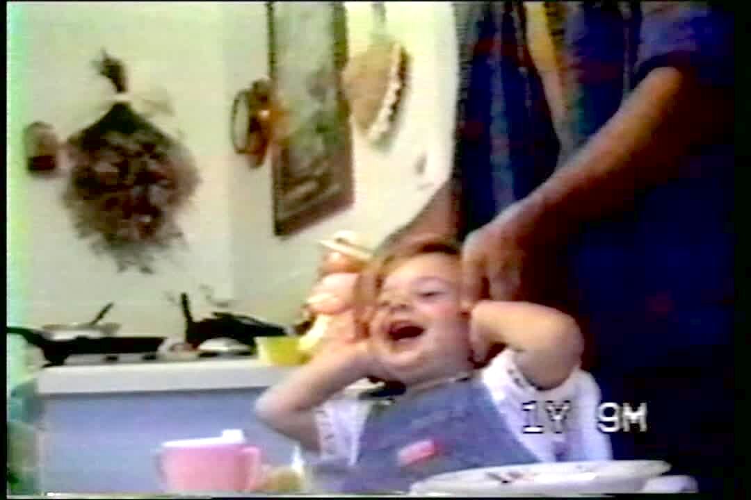 "Cup O' Frog" Woman looks in cupboard to look for chocolate sprinkles & picks up a container with a small frog in it. She screams & runs away. Boy chases her with it. Practical joke, scare.
