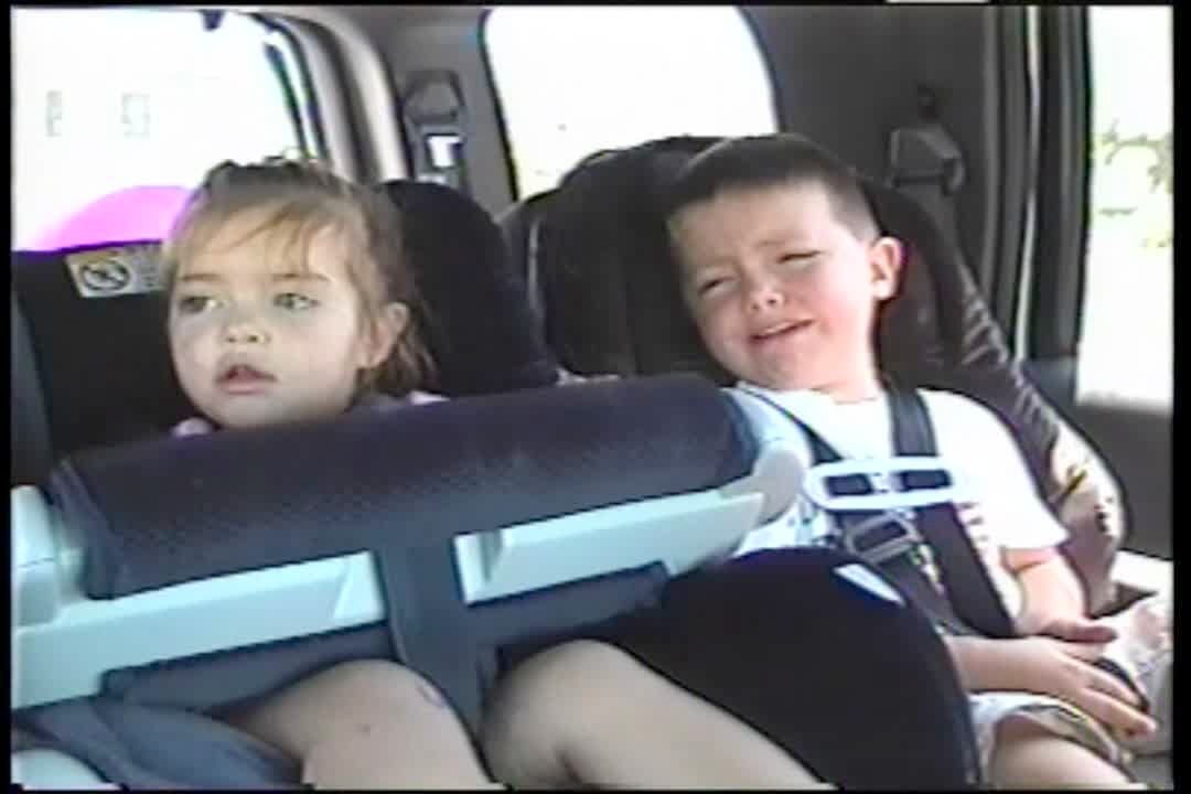 Tot boy and girl whine about having to leave the park. They sit in the back of car and scream in unison.
