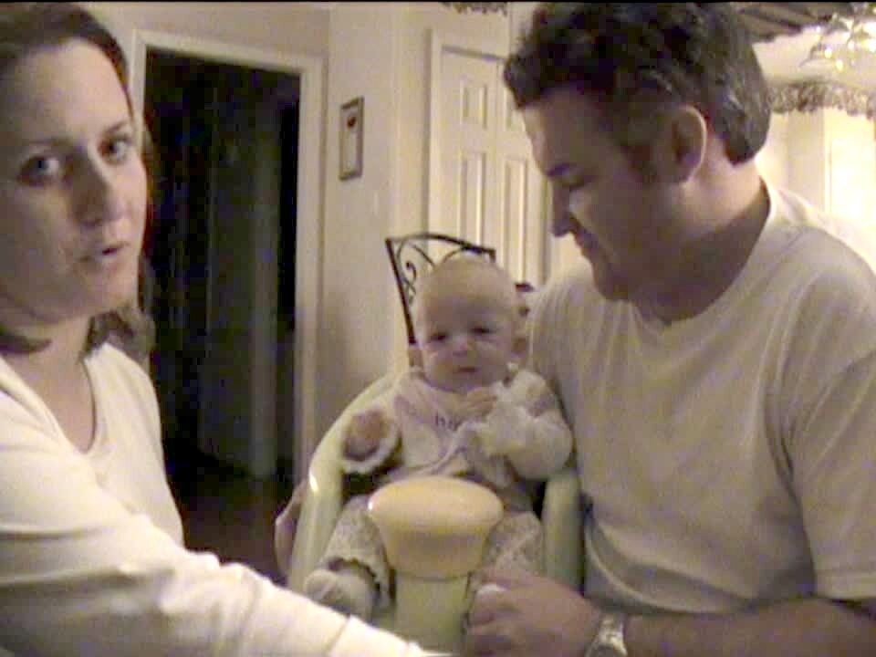 Baby girl has a funny reaction when woman sets off an alarm. Baby makes surprised face & then starts laughing.