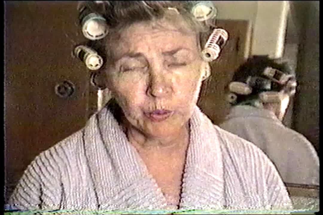 Man with a scary mask on scares old woman, creeps up on her from behind. Woman is balancing her check book at a table & says "I don't have time for this."