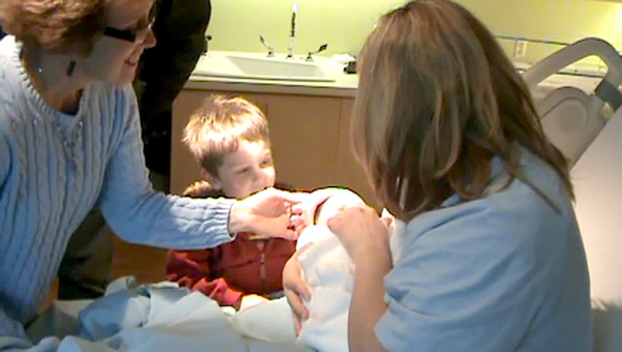 A young boy in a hospital looks at his baby brother that his mom holds. The boy says 'I knew he'd be white.' The camera man says 'I sure hope so.'