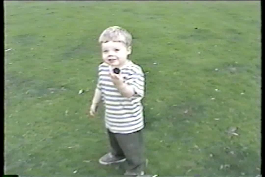 Boy playing in a field picks up a piece of poop and says, "Look, a special rock!"