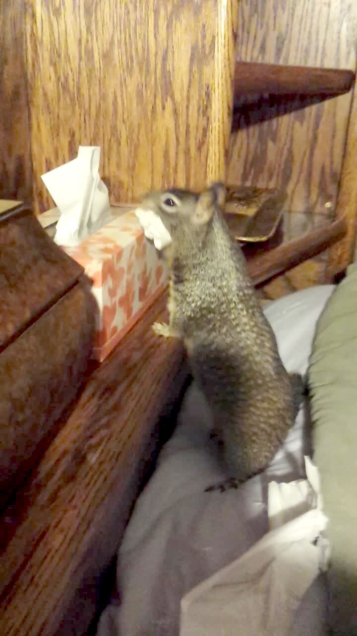 A pet squirrel takes tissues out of a Kleenex box on a bed indoors and stuffs them in its mouth.