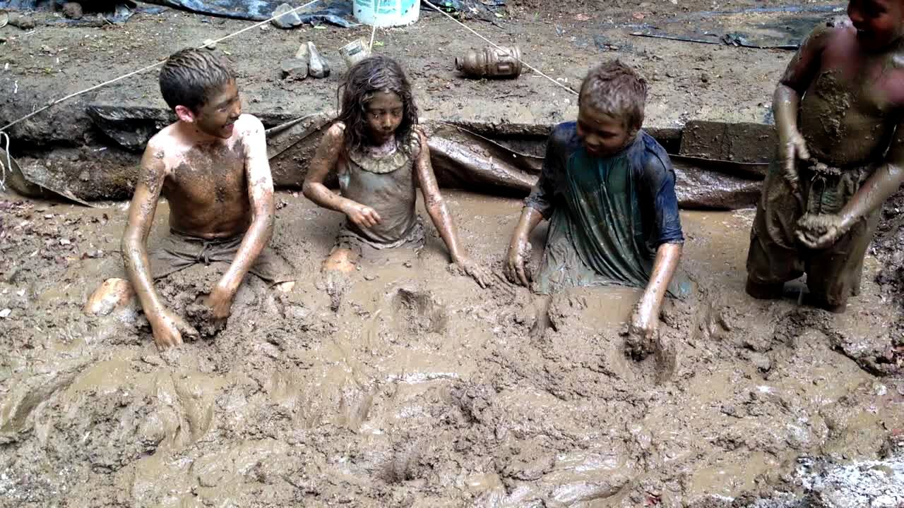 Two boys and a girl fall flat to smack their heads into mud outdoors. Another boy plays in the mud nearby.