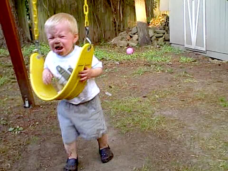 At 0:31, a two year old tot boy falls face first off of a swing and gets dirt in his face. He starts crying and walks to dad and gets hit by swing. Adjusting his path to his dad (who is filming), he trips over a toy truck and continues crying.