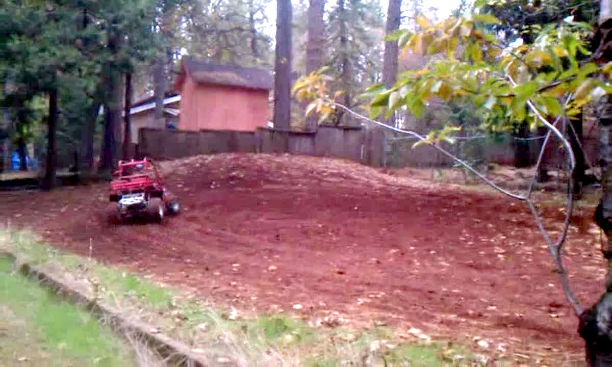 A middle age man rides around a dirt yard in a dune buggy cart. He crashes into a tree, knocking leaves off the tree. Action in first minute.