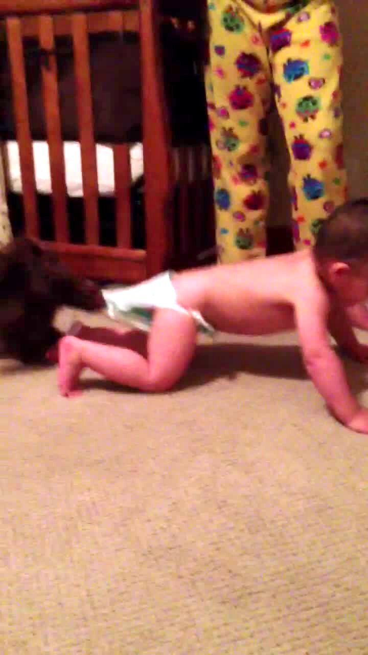 A dachshund dog pulls a baby boy's diaper off while he laughs.