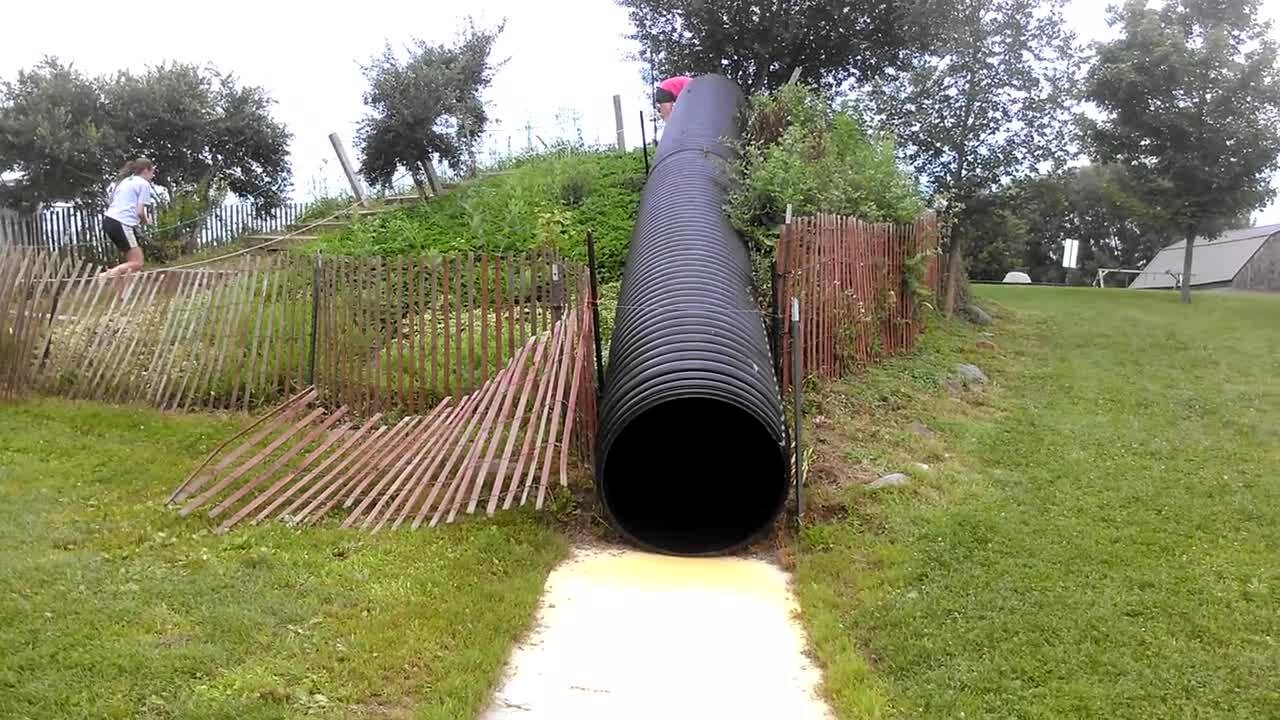 A boy makes a goat noise while going down a large plastic slide. Action at :02.