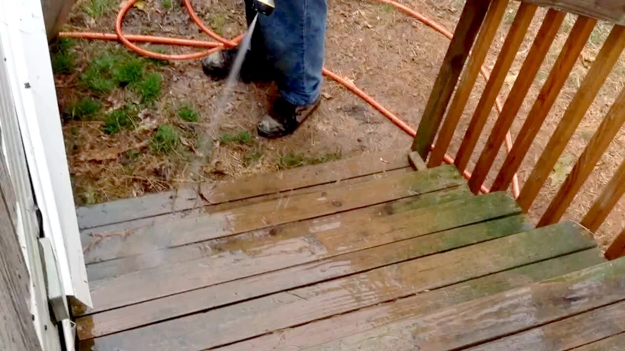 A Pitt Bull dog attacks a water hose from under a flight of stairs on the back porch.