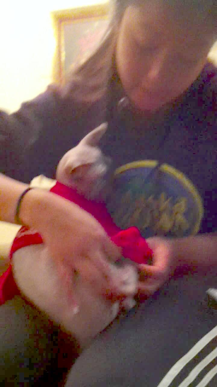 A Seal Point Sphinx cat has trouble walking with a Christmas sweater that a woman puts on it at home.