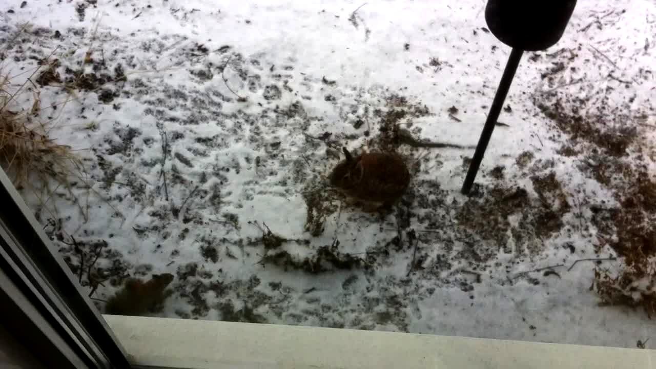 Security camera footage of a deer that runs in to a glass door. Shortly after the deer hits the door, a dog walks up to the door to look around.