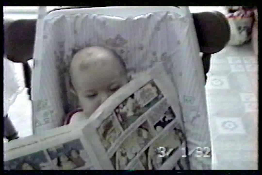 A man opens a newspaper and tries to read it in heavy wind on a deck, but he cannot get it to stay open. Frustrated, he crumples the newspaper into a ball and throws it.