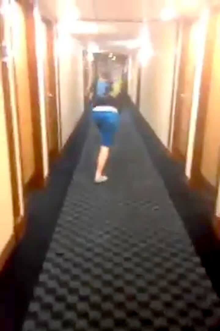A man does cartwheels down a hotel hallway, kicks the sprinkler off of the ceiling, and water floods the floor. Short tail.