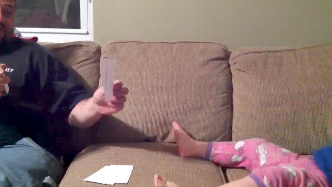 Dad is teaching little girl numbers on couch. He shows her number 8 and she says "snowman."