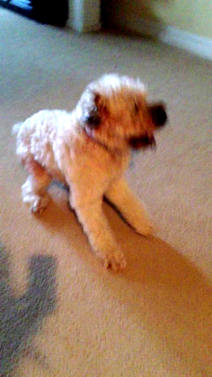 A border collie dog tilts its head back while chomping at the water from a spray bottle indoors, causing a strange popping noise from his teeth. Name that sound.