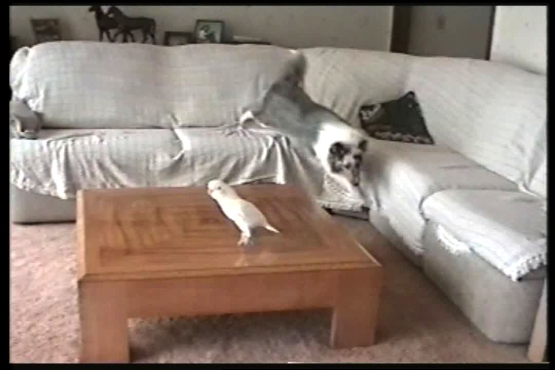 White parrot jumps in circles on a coffee table while a dog runs around the outside of the table. Funny visual.