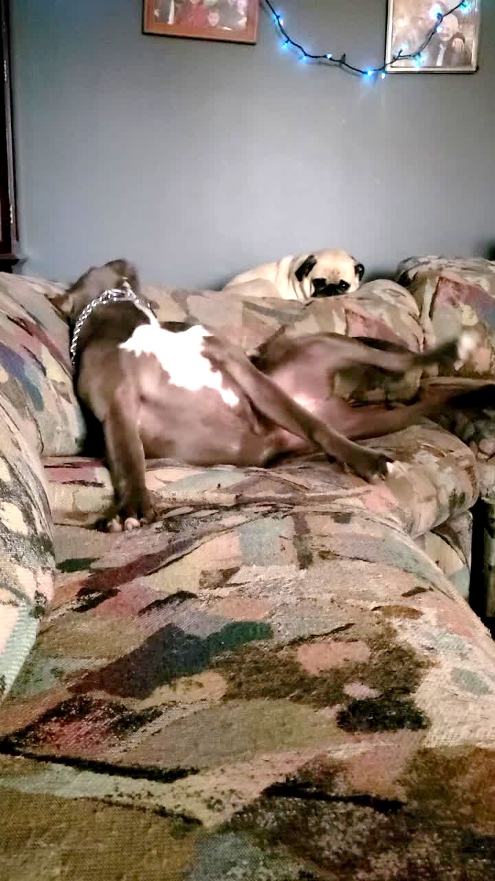 A Pit Bull dog rolling around on the couch kicks a cushion on the back of the couch and knocks the pug laying on it off the back.
