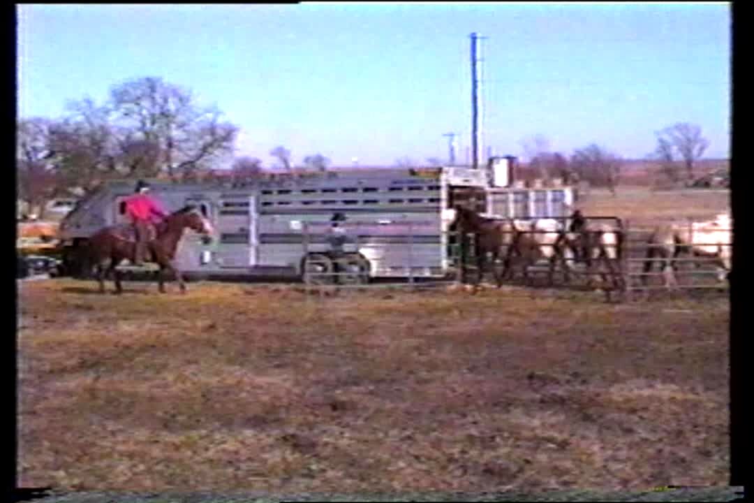 Horses. Cowboys roundup horses into trailer, pony climbs onto roof.