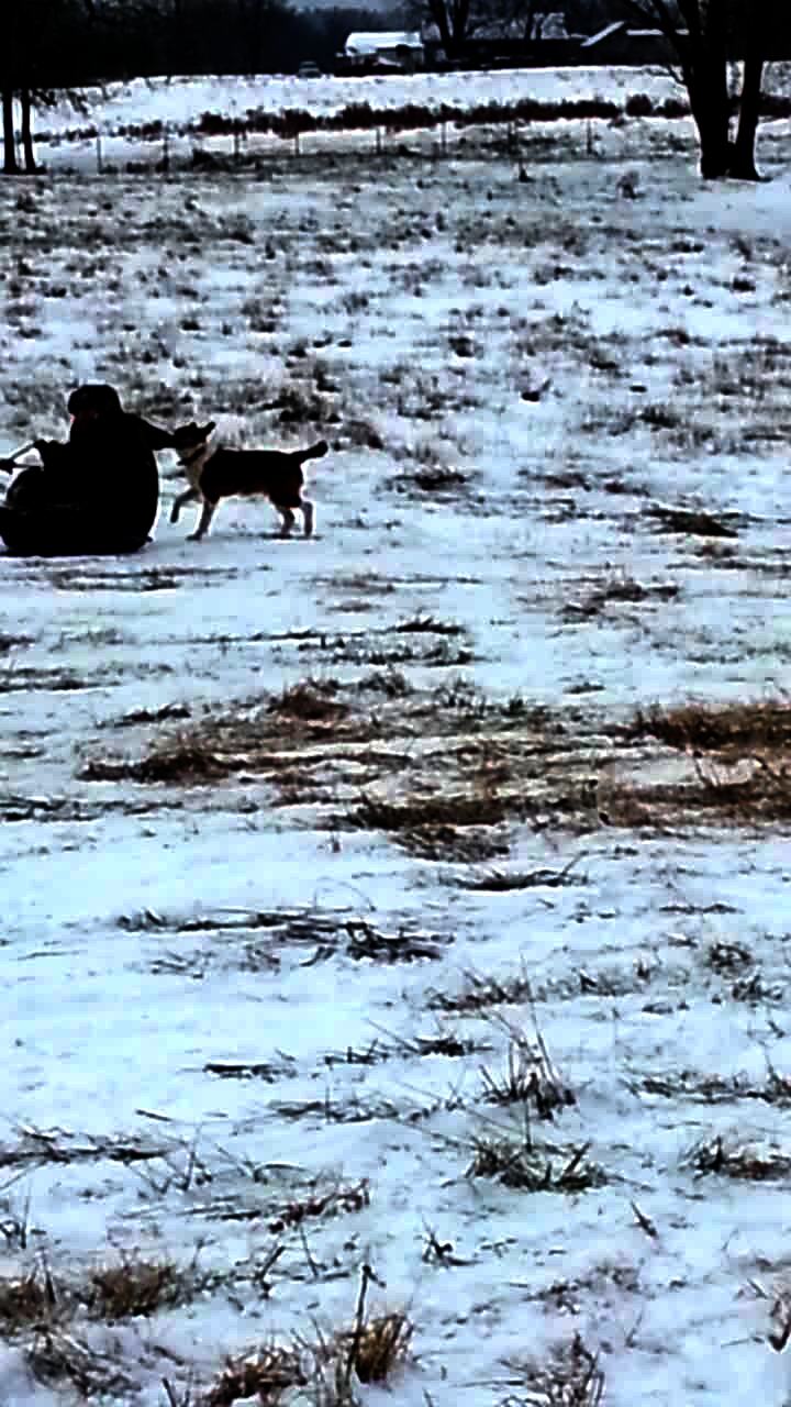 A boy rides a sled being pulled by a rope outdoors as a Jack Russel terrier dog hangs onto the boy's back and hops behind him outdoors.