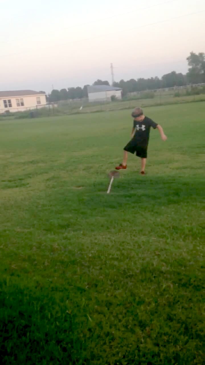Man swings sledgehammer around and throws it like a shot put. Sledge hammer slips out of man's hands and hits camera man. ouch