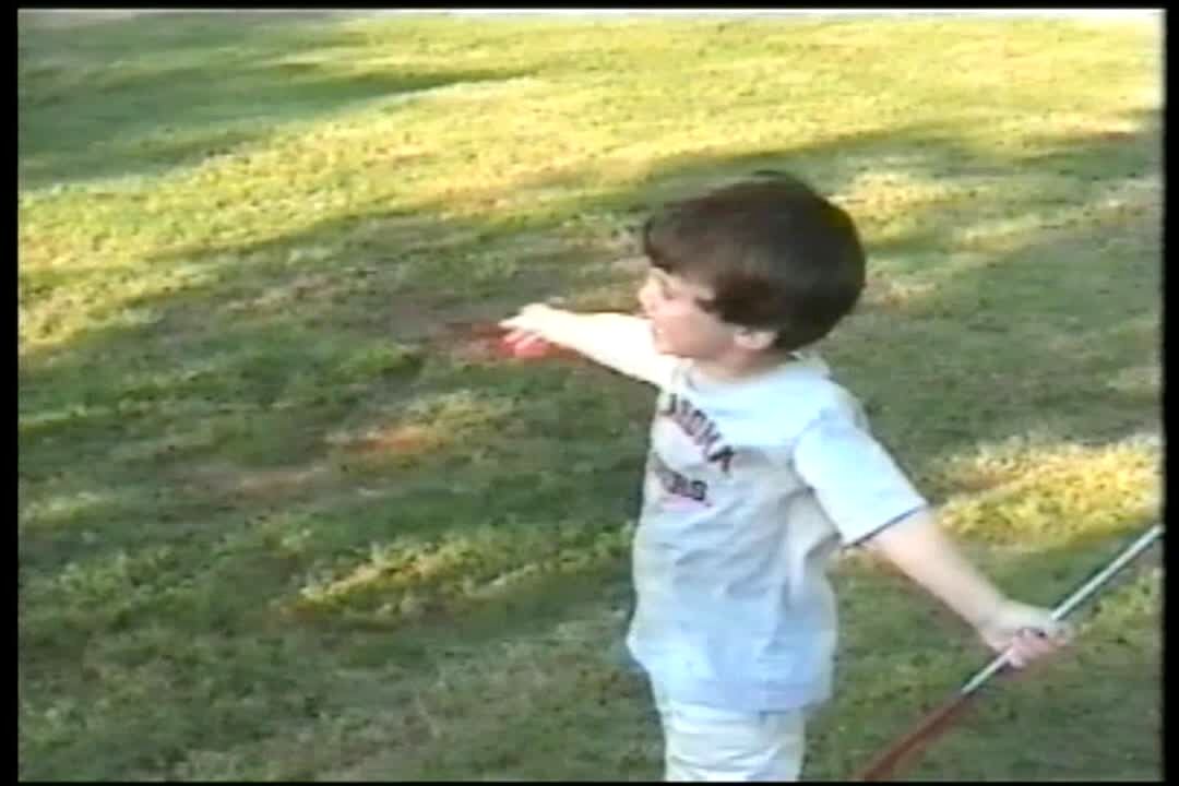 Boy trying to watch TV on a lazy boy, is frustrated by boys running around in front of him, so he lifts the leg rest up and it trips one of the boys.