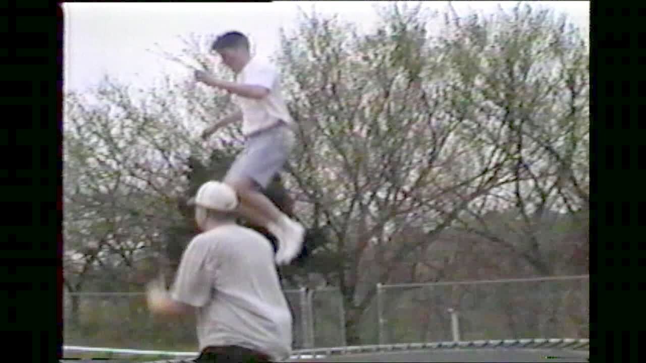 2 men jumping on trampoline break it and fall through