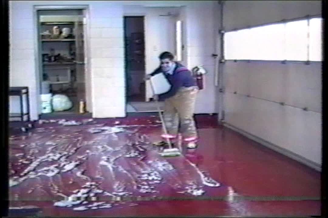 Fireman mopping station house floor, breaks broom and falls while dancing