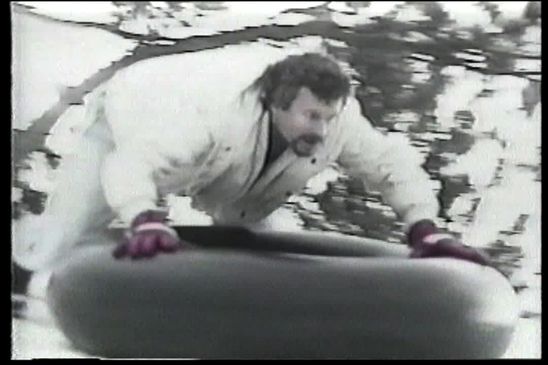 Skiing Jerk. Man tries to ski off roof of house into pickup truck. Bonehead