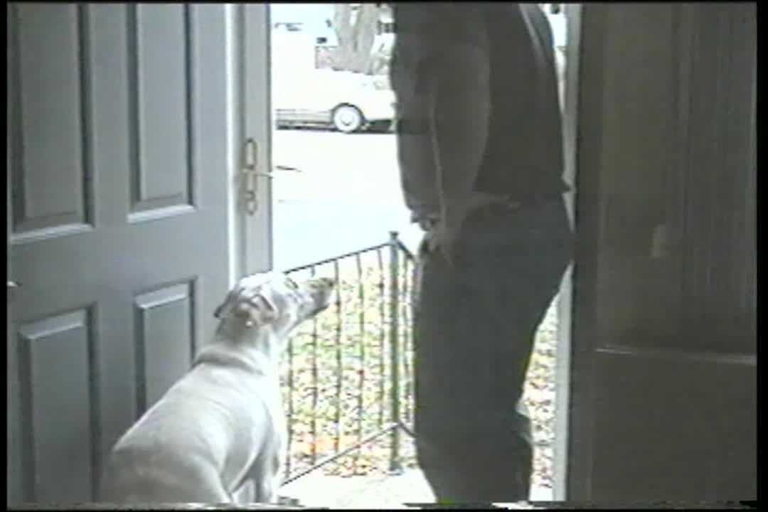 "Escape from Bark-atraz" A Pit Bull dog jumps up on a door at a dog daycare and swings it open for a group of dogs to run out of the room. Security footage.