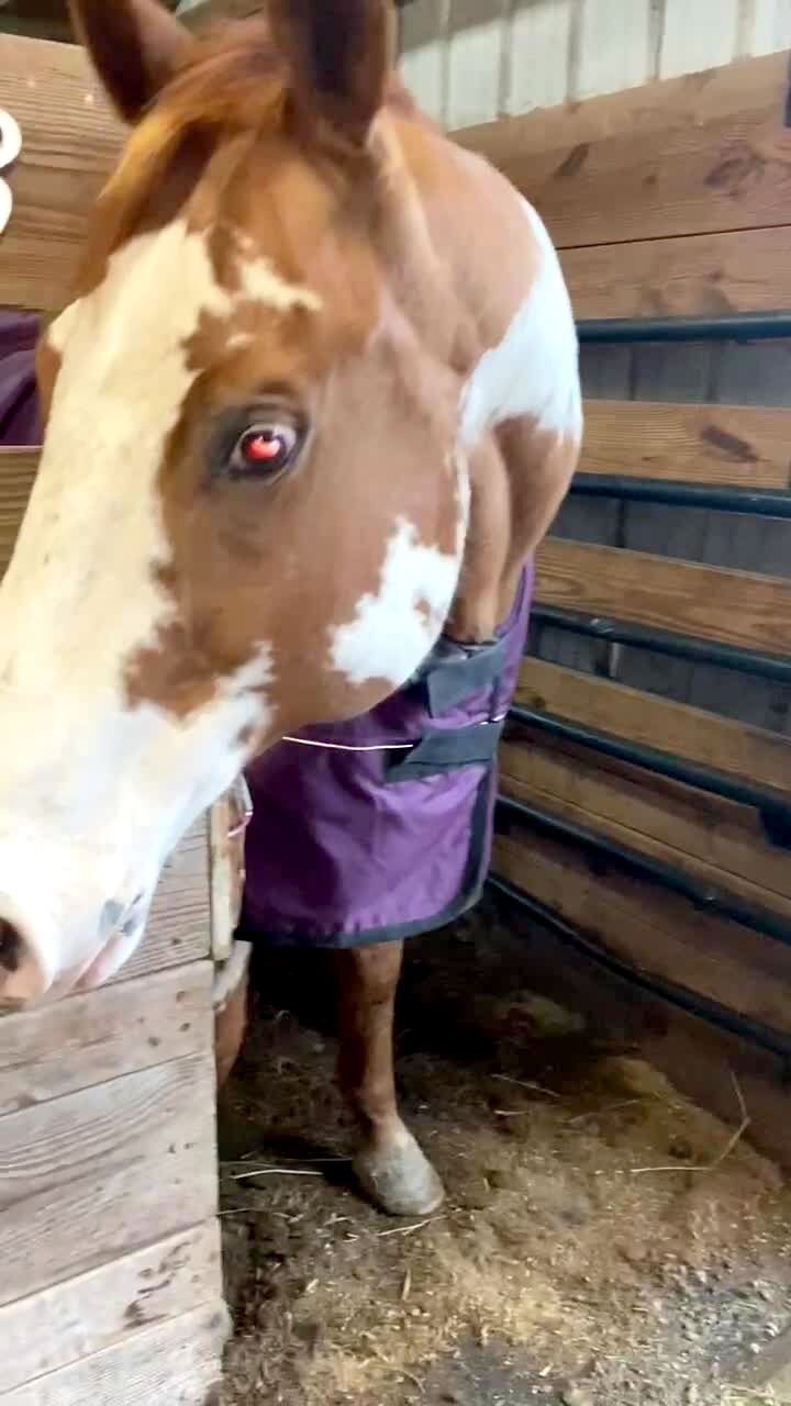 A woman with the camera opens a stable door to let a horse out and the horse sees the rain and closes the door with its nose.