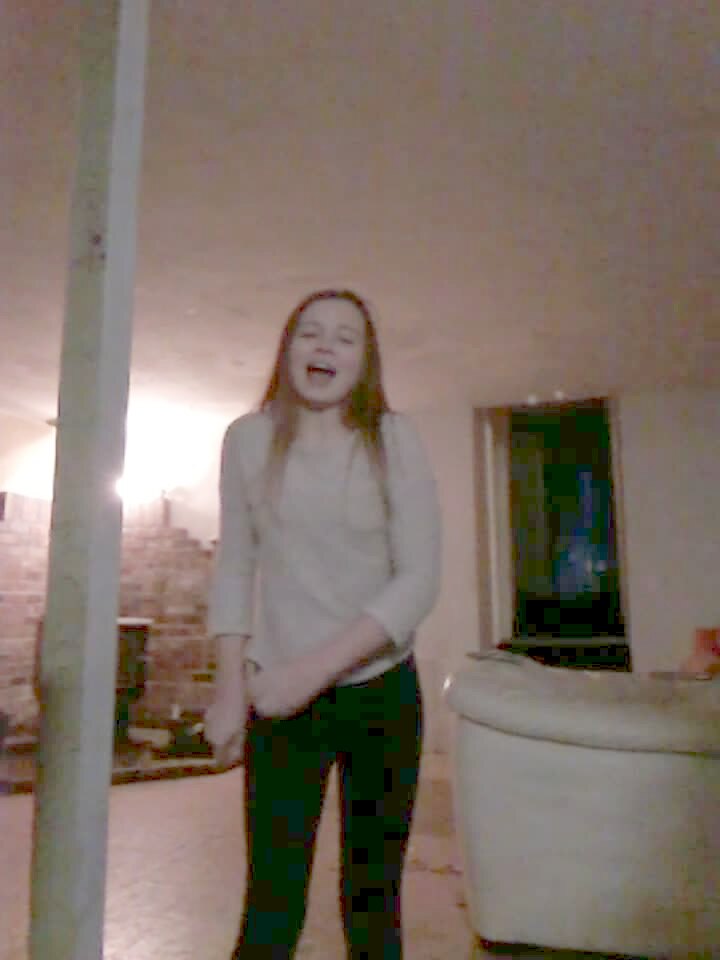 A young girl hits her hand on a pole in the living room while she waves it as she does the floss dance. Assignment America: Floss Dance.
