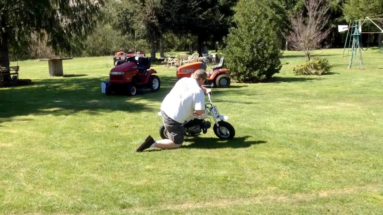 A man riding a minibike crashes outdoors while trying to do a wheelie.