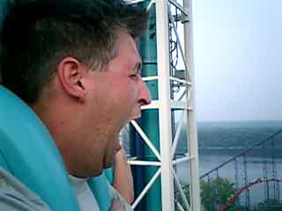 Man tries to use a water balloon sling shot, but it backfires and he shoots the balloon at himself. Summer.