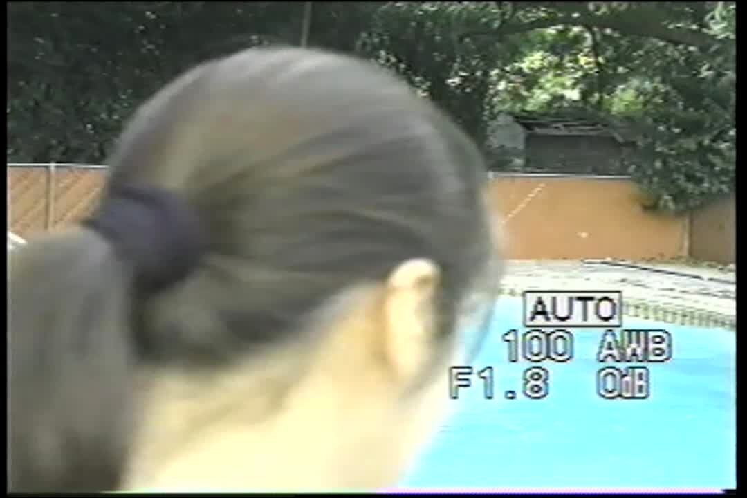 golf - backyard golfer chips shot up and into his hat. Date on screen 1992.