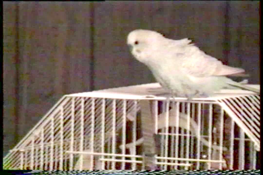 Bird talks to a fake plastic bird in its cage. He gives it kisses & says "Pretty bird."