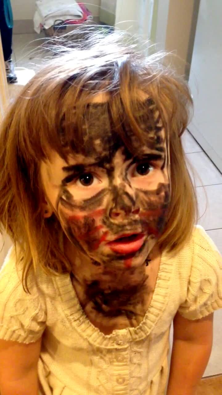 A young girl with make-up all over her face gets upset when her mom tells her it won't come off and she'll have to go to school with it. She points to her older sister and says "It was her idea" while her sister puts a make-up beard on her face.