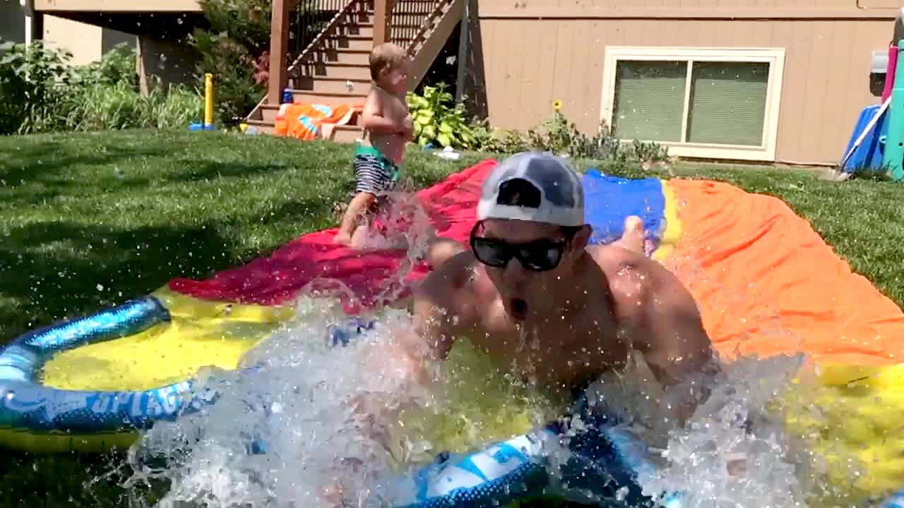 A father slides down a slip n slide and his foot trips up his tot son and knocks him down in slow motion.