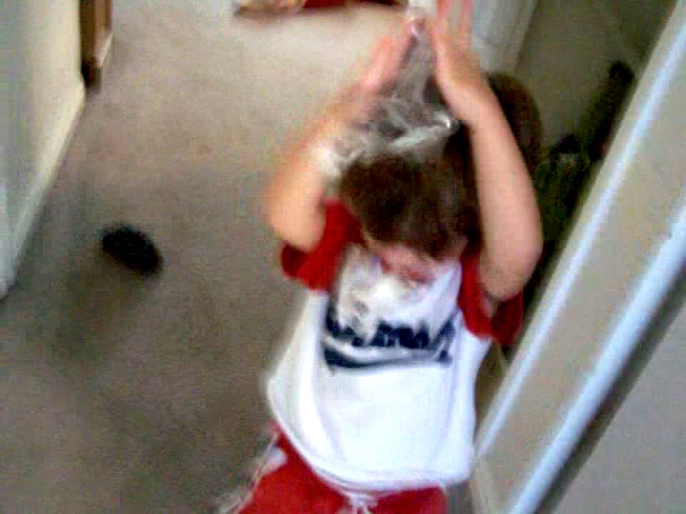 A tot boy gets scotch tape tangled around his head and hair and cries when he can't get it out. He looks at the camera and says "Uh oh."
