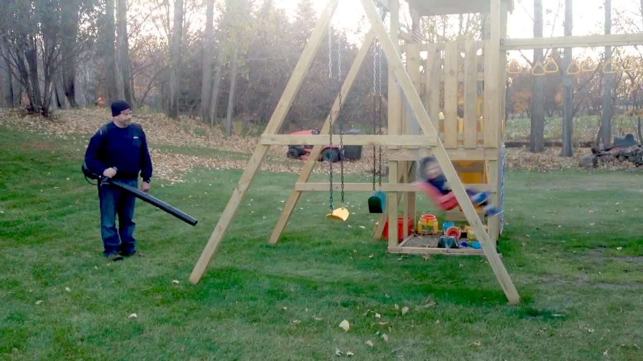 A tot boy swings on a swing-set outdoors while his dad stands behind him and lifts a leaf blower up to push the boy's swing.