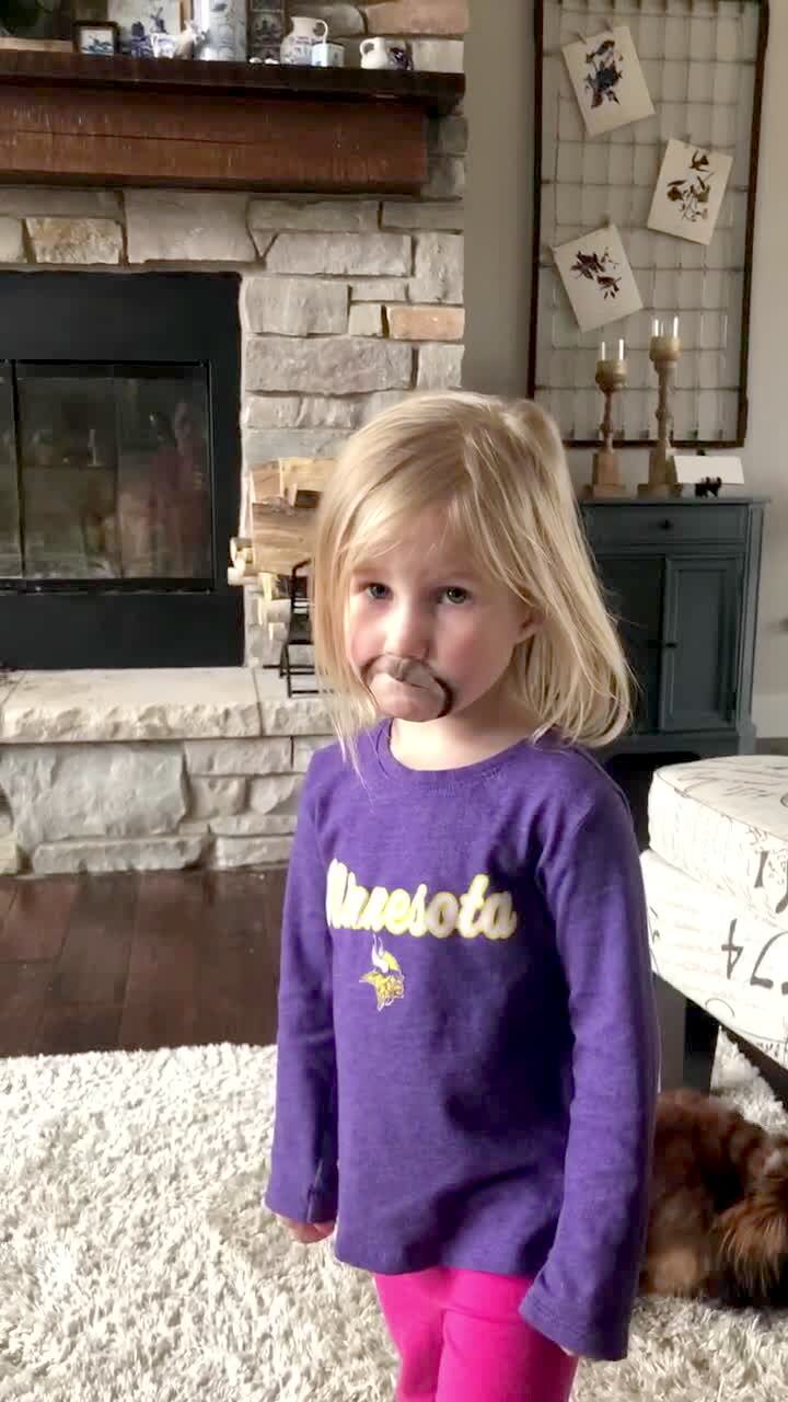 A woman finds her young daughter with marker all over her lips, and arms drawing on the wall. The mothers asks the daughter if she's supposed to be coloring on the wall and the girl shrugs.