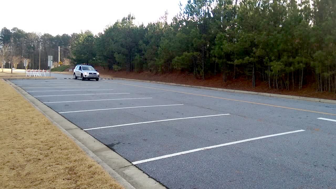 A woman practices parallel parking between two chairs in an SUV in a parking lot outdoors. She hits the chair behind her then runs over the chair in front.