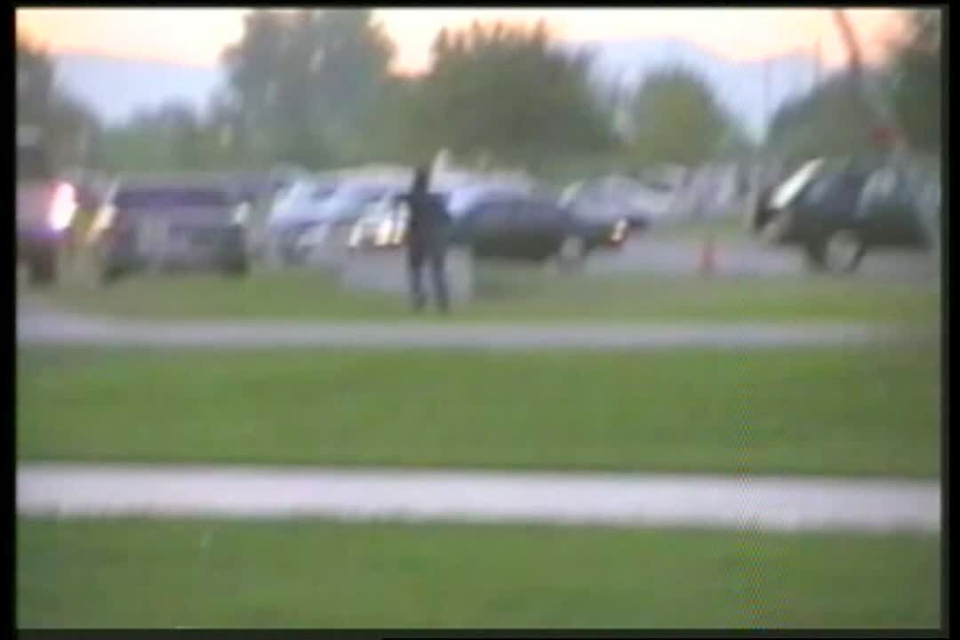 A man parks a car in a parking lot and gets out and gets chases by a goose bird and gets knocked to the ground. Security camera.